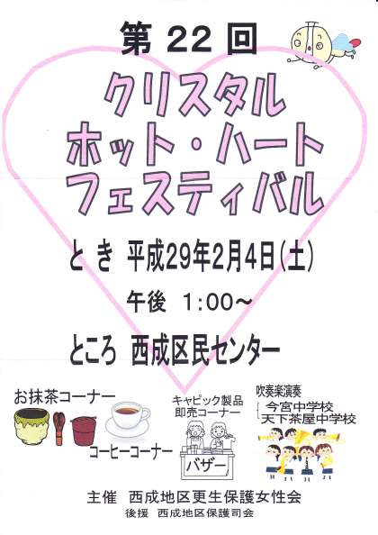 2月5日(土)午後1時より、西成区民センターで、西成地区更生保護女性会主催の「クリスタルホット・ハートフェスティバル」が開催されます。その中で、本校と今宮中学校の吹奏楽部が演奏をします。保護者、地域の皆様、お時間があればご来場いただき、本校と今宮中学校の子どもたちに、大きな声援を送ってください。