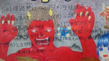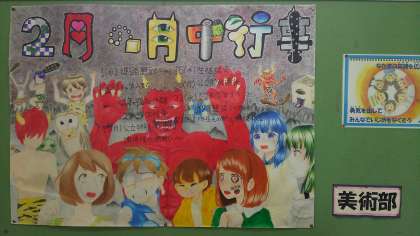 美術部の制作による2月行事予定表が、中央階段の踊り場に掲示されました。今月は節分にちなんで、大きな赤鬼の登場です。美術部の皆さん、これからも素敵な作品を期待しています。