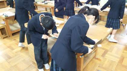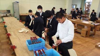 1年生の技術科授業のようすです。木材加工の授業で、本立てを製作しているところです。子どもたちは、のこぎりややすりと大格闘です。