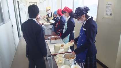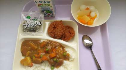 本日の給食のメインは、子どもたちの大好きなカツカレーライスでした。デザートのフルーツ白玉もおいしくいただきました。明日の給食も楽しみです。