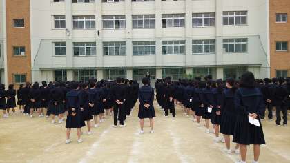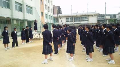本日の全校朝礼のようすです。まず最初に、生徒委員会の認証式が行われました。続いての学校長より、学級の委員を中心にしながら全員が協力して学校をよくしていくことの大切さについて講話がありました。生徒指導部長からは更衣調整期間について、生徒会からは中間テストに向けての学習の仕方について、それぞれ話がありました。