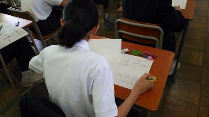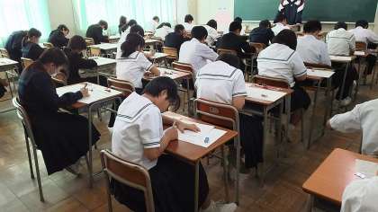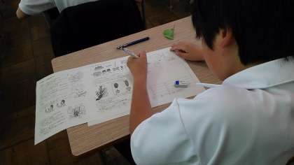 中間テストが始まりました。どの学年の生徒も真剣に取り組んでいます。写真中・下は1年生の理科のテストのようすです。植物の葉をスケッチするパフォーマンステストも実施されました。