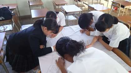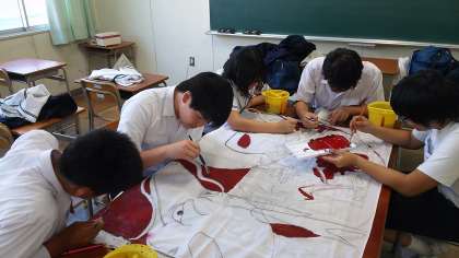 各クラスで、体育大会の学級旗の製作が始まりました。本日は、1年生(写真上)と3年生(写真下)が取り組んでいました。できあがりが楽しみです。