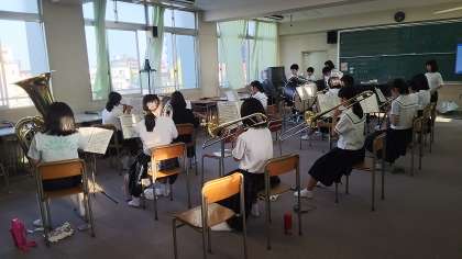 吹奏楽部の活動のようすです。体育大会に向けて、一生懸命練習をしていました。当時の力強い演奏を楽しみにしていますね。
