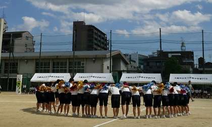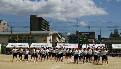 体育大会のしめくくりは、3年生女子の「ダンス」と「集団行動」です。写真はダンスのようすです。元気と笑顔が、見ているものにエネルギーを与えてくれる素敵な団体演技でした。