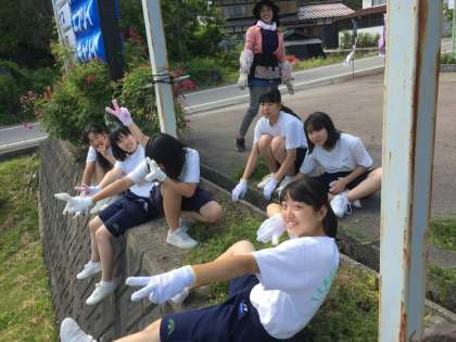 写真下 楽しく草引き