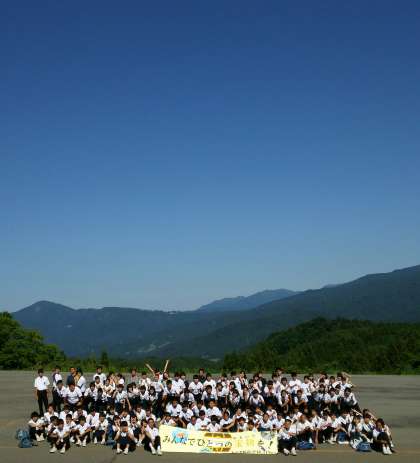 大自然をバックに記念撮影。天まで抜ける青空のもと。