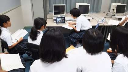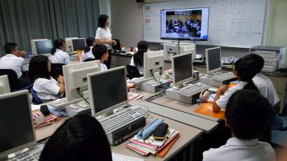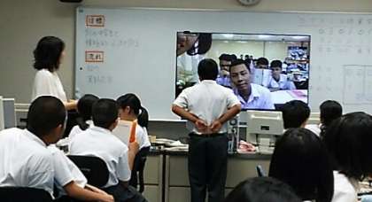 2年生の英語授業のようすです。コンピュータのテレビ電話機能を使い、タイ王国の中学生と英語を使って交流しているところです。