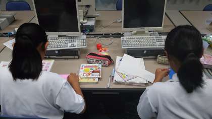 タイ訪問研修に向けて、2年生の代表生徒がプレゼンテーションの資料を作成しているところです。日本を紹介するための資料の作成です。