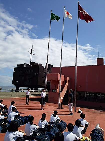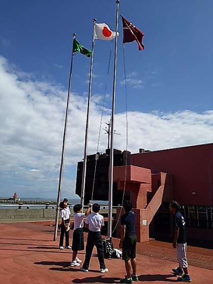入所式を行い、施設の広場に天下茶屋中学校の校旗を掲揚しました。この後、砂浜でビーチレクリエーションを楽しみます。