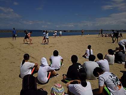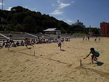 砂浜オリンピックでは、ペアで協力してのボール運びやピーチフラッグで盛り上がっています。