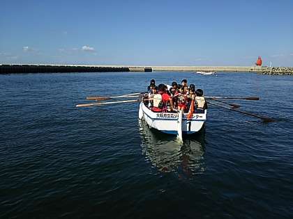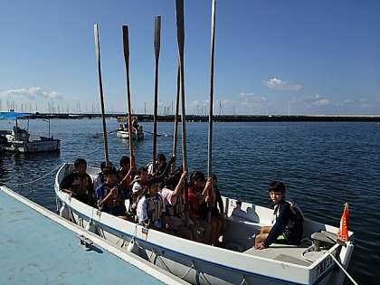 海の活動のようすです。こちらの写真はカッターボートに乗っているところです。全員で声を合わせて、少し沖まで船を出しました。