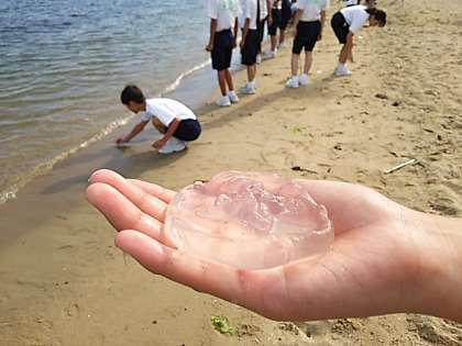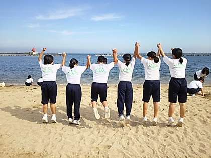 クラゲを捕まえたり、みんなでジャンプしたり、砂浜に落書きをしたりなど、思い思いの楽しみ方をしていました。