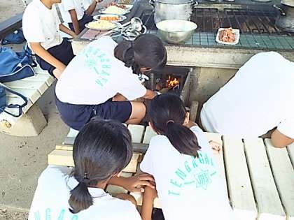 かまどに火がつかず、悪戦苦闘している班もあります。頑張れ!