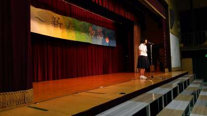 9月30日、文化発表会を実施しました。それまで取り組んできた成果を、しっかりと発揮してくれました。写真は、オープニングセレモニーにおいて、生徒文化発表会実行委員長が話をしているところです。今年度の文化発表会スローガンは「彩(いろどれ)〜新たな物語を〜」です。