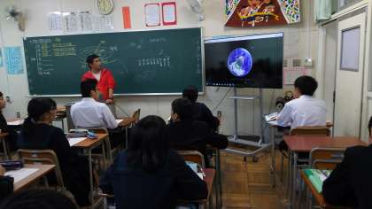 3年生の理科授業のようすです。天体に学習において、天文シミュレーションソフトを使い、太陽系や銀河系のつくりについて学習しているところです。