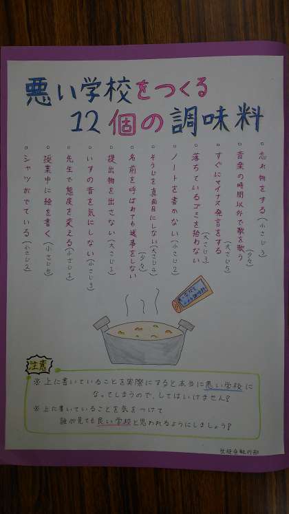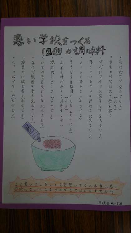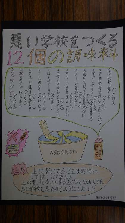 生徒会では、学校をよくするための取組を続けています。この度、生徒執行部では、「学校を悪くする12個の調味料」と題したポスターを製作しました。その中で、当たり前のことを当たり前にすることの大切さを啓発しています。