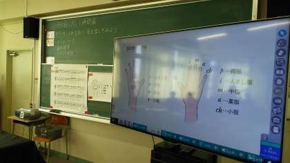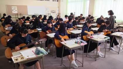 3年生の音楽授業のようすです。写真は、ギターの基礎を学んでいるところです。「指がいたい」などと言いながらも、楽しく弦をはじいていました。