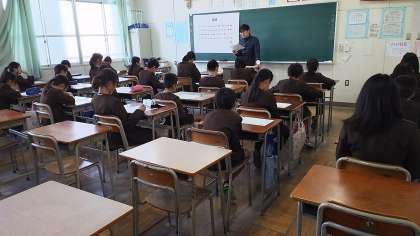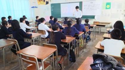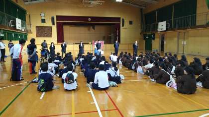 本日、児童見学交流会を実施しました。橘小学校、天下茶屋小学校の児童が参加し、授業体験と部活動体験を行いました。始めと終わりには、本校生徒会役員からあいさつや説明をしました。