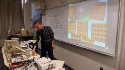 2年生の英語科授業のようすです。C-NETによる、ゲーム性を持たせた名詞と形容詞の学習です。各班ごとに、一人一人が思考力を働かせるとともに、しっかりと対話をしながら授業は進行しました。