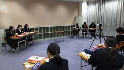 2年生の英語授業のようすです。テーマを決め、それに対して日本語と英語を使ったディベートをおこなっているところです。