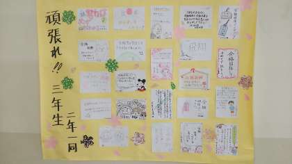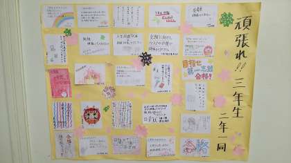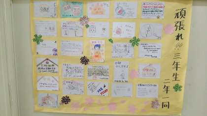 3年生の各教室前には、2年生が国語科で作った「3年生応援メッセージカード」が掲示されています。2年生の熱い思いのこもったカードです。