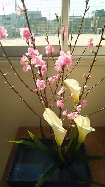 いつも地域の方が生けてくださる花の写真です。春らしく、淡く明るい彩の作品です。いつもありがとうございます。