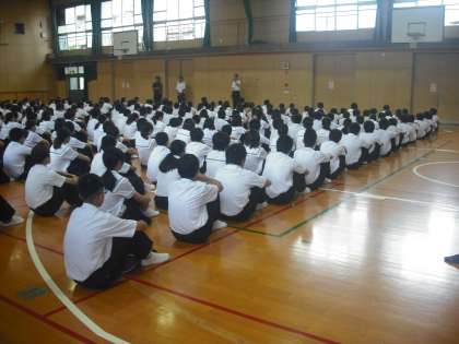 7月18日、1学期終業式を実施しました。学校長より、夏休みを有意義に過ごすためには、「早寝早起き」「読書をすること」「毎日勉強すること」「部活動に全力投球」「一日一善」などを実践しようという講話をしました。