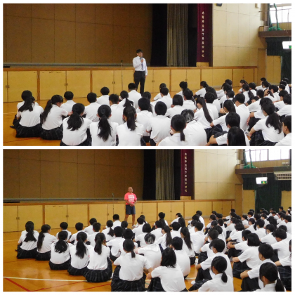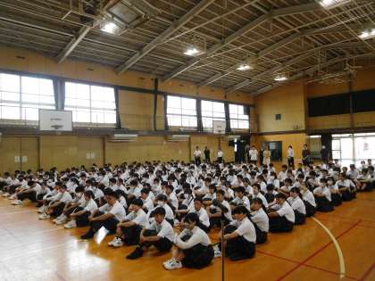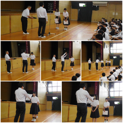 始業式のようすです。夏休み期間中に活躍した水泳部、バドミントン部、吹奏楽部の代表の人に表彰伝達を行いました。始業式では、校長先生、生活指導の先生から2学期に向けてのお話をしました。