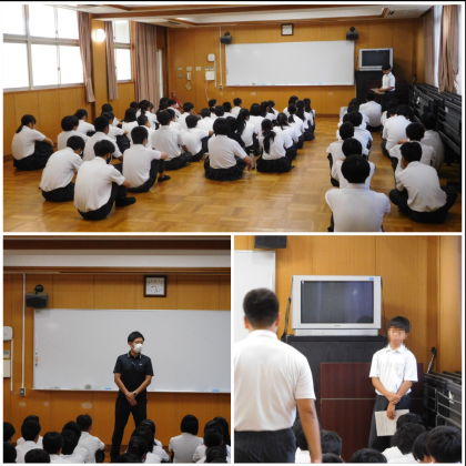 本日は朝から2年生が学年集会を行いました。担当の先生から夏休みの思い出や楽しかったことなどの振り返りと2学期がスタートして新たな気持ちで頑張りましょうとのお話がありました。