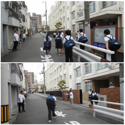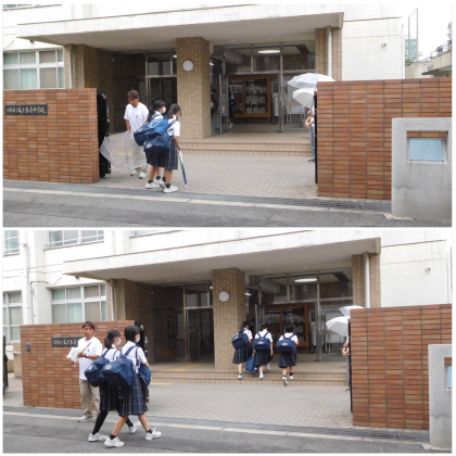 本日の朝登校のようすです。朝から雨が降ってりやんだりと小雨模様です。台風が近づいている影響のようです。今日も頑張りましょう。