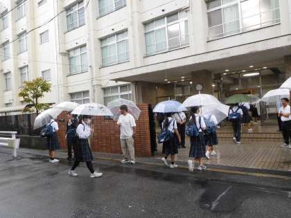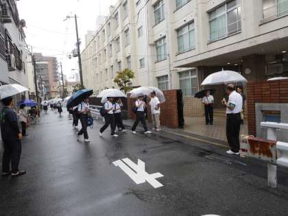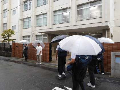 本日の朝登校のようすです。台風の影響で朝も雨が降り続いています。お昼ごろにはやむ予報です。今週最後の日、頑張りましょう