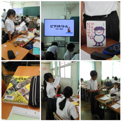 1年2組国語の時間に、ビブリオバトルの取組を行いました。自身が気に入った本の内容をまとめ他の人に紹介するという取り組みです。皆さん、自身で選んだ本を楽しそうに紹介していました。
