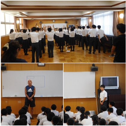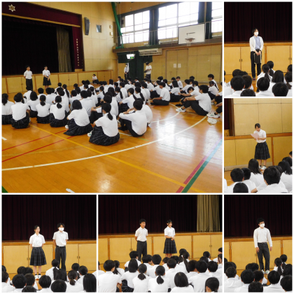 本日は朝から2年生と3年生が学年集会を行いました。2年生では担当の先生からお話がありました。3年生では各委員会の代表の人から今月の目標を発表してくれました。