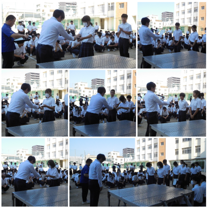 本日は朝から全校集会を行いました。清掃強化週間のクラス表彰を行いました。校長先生からは、みんなが過ごしやすい教室とはごみの落ちていないきれいな空間とやさしさや気づかいあふれる思いやりの空間ですとのお話しました。皆さんそれぞれ悩みを抱えているとは思いますが、学校は楽しいと思える空間づくりに協力しましょう。