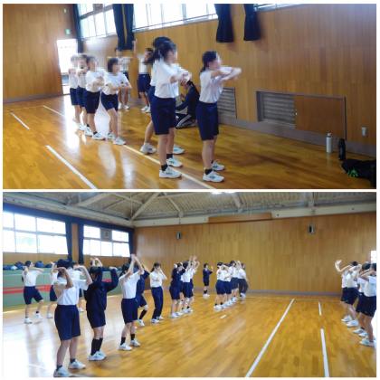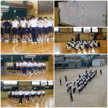 1〜3時間目に3年生が体育大会に向けて学年練習を行いました。全体での入場行進の練習のあと、男子は集団行動、女子は創作ダンスの練習をしていました。