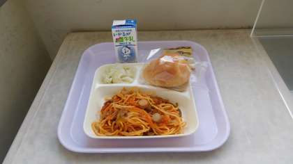 本日の給食は、イタリアンスパゲッティ、サワーキャベツ、カレーフィッシュ、ミニコッペパンでした。