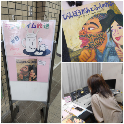 本日は給食の時間に、ランチタイム放送を行いました。今回は「びんぼうがみとふくのかみ」の朗読でした。貧乏だが働き者の夫婦に家に貧乏神がいました。貧乏神が家を出ていこうとしましたが、夫婦が引き止め、福の神がやってきて貧乏神を追い出そうとしても引き止め、夫婦は貧乏でしたが幸せに暮らしましたというお話でした。