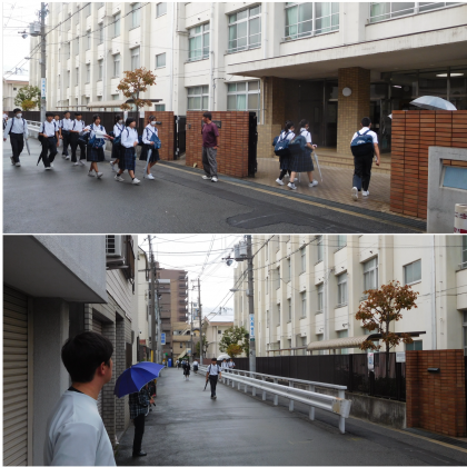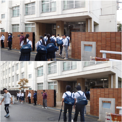 本日の朝登校のようすです。朝から降っていた雨も登校時にはやんでいました。今日は一日雨予報です。がんばりましょう。