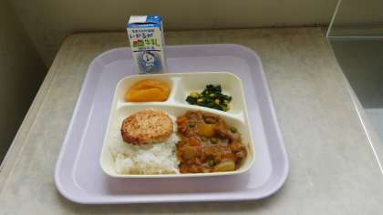 本日の給食は、ポークカレーライス、焼きとうふハンバーグ、ほうれんそうのソテー、黄桃(缶)でした。