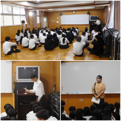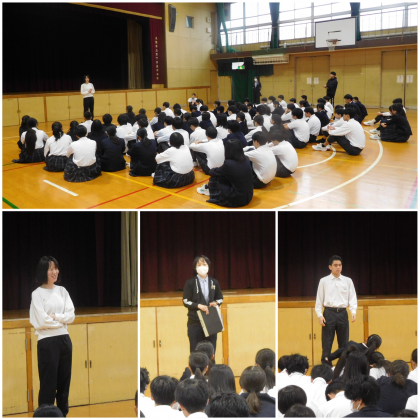 本日は朝から2年生と3年生が学年集会がありました。担当の先生が自身の体験から大人になるにあたり中学校生活の大切さについてお話してくれていました。