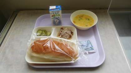 本日の給食は、豚肉のガーリック焼き、コーンスープ、きゅうりのバジル風味サラダ、コッペパン、ブルーベリージャムでした。