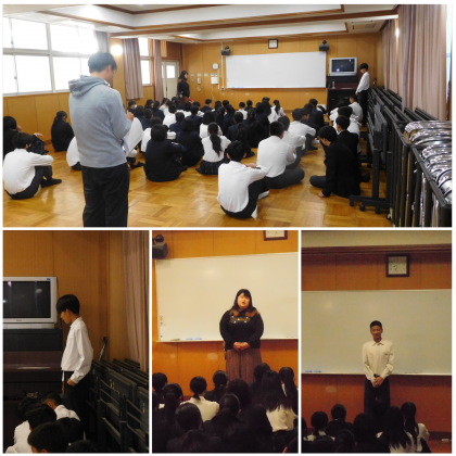 本日は朝から2年生が学年集会を行いました。担当の先生から自身が先生になったきっかけなどをお話してくれていました。来週の職場体験に向けての心がまえにつながるお話でした。