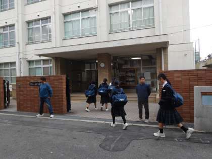 本日の朝登校のようすです。くもり空で冷ややかな朝となっています。今日から2日間2年生が職場体験に行きます。事業所にもよりますが、朝早くから出発する班もありました。がんばってきてください。