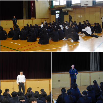 本日は朝から3年生が学年集会を行いました。担当の先生から残り少ない中学校生活を大切にしてほしいとのお話がありました。