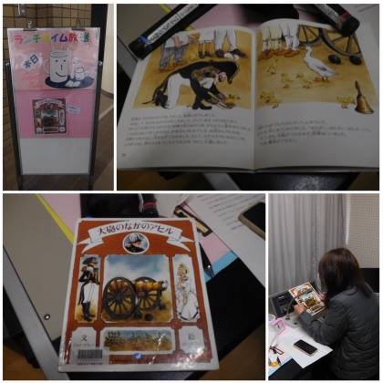 本日は給食の時間にランチタイム放送を行いました。今日は、ジョイ・コウレイ作「大砲の中のアヒル」の朗読でした。戦争をしようとする兵士たちが大砲の中にアヒルが巣を作り卵を温めていたため、撃てなくなり、休戦中にひなが生まれそのひなが成長する過程で兵士たちが戦争を嫌い、平和を願うようになったお話です。興味のある人は図書室に読みに来てください。