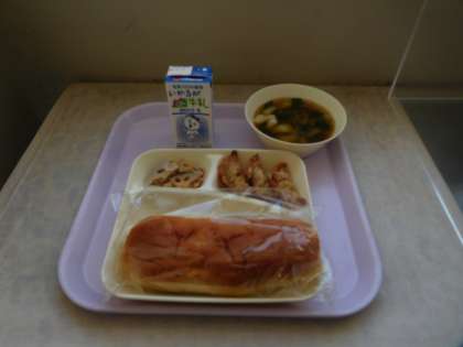本日の給食は、あげギョーザ、れんこんの中華だれかけ、中華みそスープ、おさつパンでした。今日も美味しくいただきました。