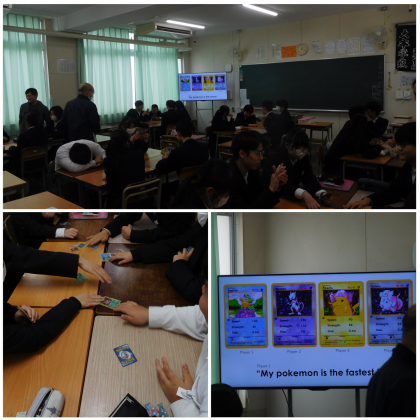 2年生のC‐NETの先生による英語授業です。お手製のカードを使って楽しく勝負しながら英語に親しんでいました。