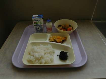 本日の給食は、卵の千草焼き、まる天とやさいの煮もの、のりのつくだ煮、発酵乳でした。本日もおいしくいただきました。ごちそうさまでした。、