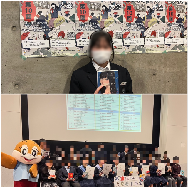 1月11日(日)に大阪府咲洲庁舎で大阪府中高生ビブリオバトル大会が開催されました。本校からも1年生国語の授業で取り組み、選ばれた代表1名が参加しました。緊張はしていたと思いますが、終始笑顔で発表してくれました。残念ながら全国大会への出場は叶いませんでしたが、たくさんの先生や友だちも応援に駆けつけてくれて、良い経験となったのではないでしょうか。